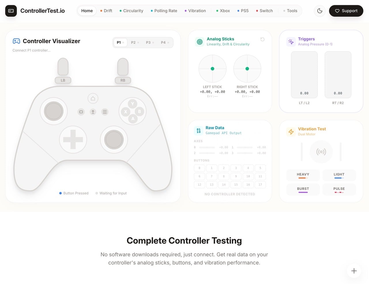 今天要推薦的「ControllerTest.io」是一個專業級線上遊戲控制器(手把)檢測工具,透過這個網站可以在沒有下載安裝任何軟體、驅動程式的情況下測試手把的各個實體按鍵和健康狀態,只需要將遊戲控制器以線材連接到電腦即可使用。目前支援 PS5、Xbox 和 Switch 控制器,檢測項目包括測試按鍵反應、搖桿漂移、搖桿線性與圓周率誤差(Circularity Error)、回報率(Polling Rate)和震動等。