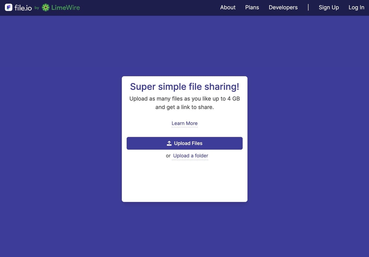 以前介紹過 File.io 是一個很簡單、方便且安全的免費空間,號稱是檔案分享版的 Snapchat!後來 File.io 被另一家公司 LimeWire 收購,成為旗下的服務,從網路資訊得知 LimeWire 收購許多類似的免空,應該都是導向自家的檔案分享服務。無論如何,使用者依然可以透過這個簡單好記的網址來分享檔案,使用時無需註冊或登入,直接開啟網頁、選擇要上傳分享的檔案即可快速建立下載鏈結。