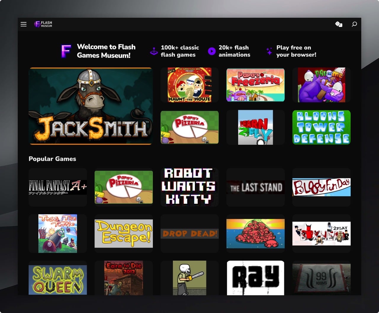Flash Museum 內建 Ruffle 這款 Flash Player 模擬器,使用者不需要安裝額外的 Flash Player 外掛,即可使用現代化瀏覽器直接執行這些作品。每個遊戲依照發布年份、系列、語系、標籤及熱門程度進行分類,亦可從遊戲類別或關鍵字進行搜尋,有不少很經典、曾經膾炙人口的小遊戲。