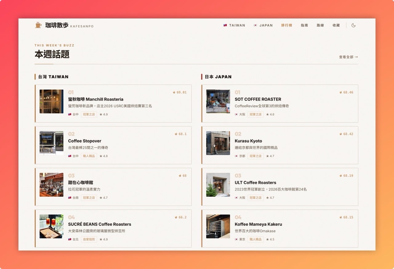 從咖啡散步網站可以發掘台灣各縣市、日本特定城市的咖啡店情報,依照「話題度」進行排名,若有特別偏好,還能利用標籤快速篩選出符合條件的店家,例如:自家焙煎店家、贏得比賽冠軍殊榮店家、有風景或是開在老宅裡的咖啡店等。