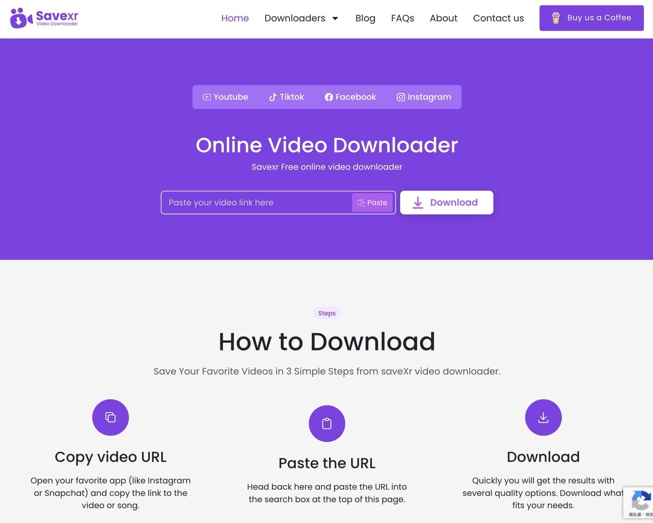 開啟 SaveXR 網站會在上方看到線上影片下載功能,使用方法很簡單,只要將影片網址複製、貼上,選擇格式後就能快速取得檔案。SaveXR 支援 YouTube、TikTok、Facebook、Instagram 和 Snapchat。