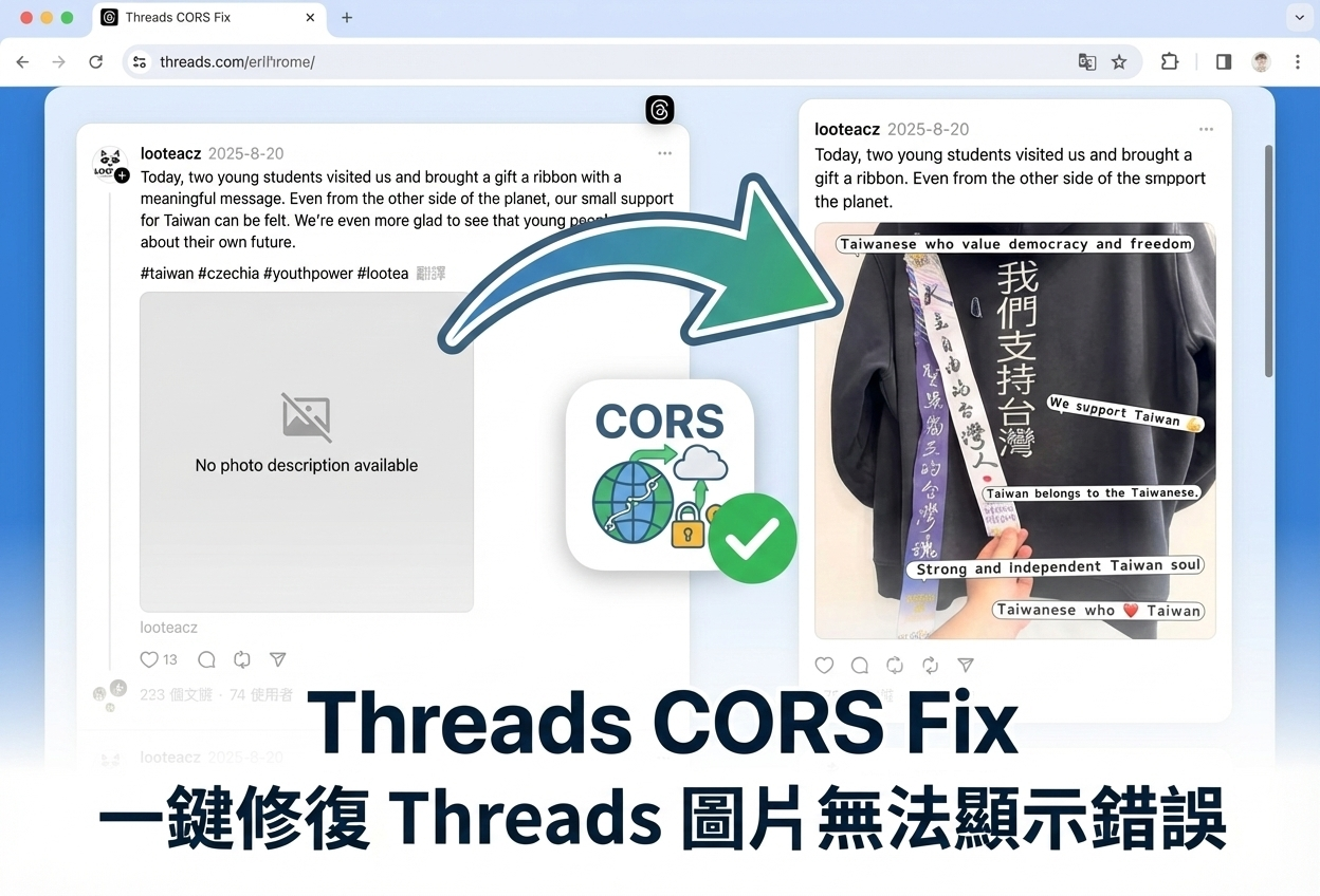 這款名為「Threads CORS Fix」的免費 Chrome 擴充功能是由台灣開發者 Hiraku(皮樂)開發製作,只要安裝後就能解決並修復 Threads 圖片無法顯示的錯誤,已經被列為 Threads 使用者必須要安裝的外掛之一(另一款是之前我曾介紹過的 Lee-Su-Threads),如果你也是電腦版使用者推薦安裝一下。