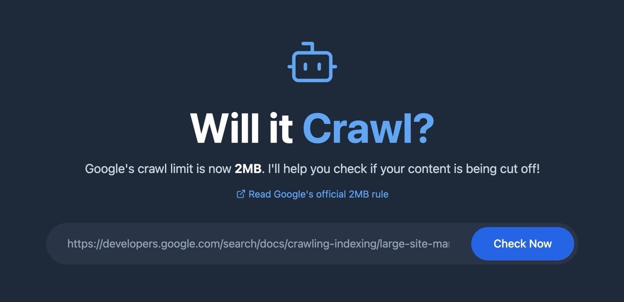 有國外開發者製作一個名為「Will it Crawl?」線上工具,可以在貼上網址後直接檢查網頁有沒有超過 2 MB,此外,結果頁面也會清楚顯示總頁面大小、可抓取比例、無法抓取比例和舊限制(15 MB)等資訊,透過可視化方式讓使用者知道 Googlebot 可抓取的範圍,更有利於找出網頁可能的問題。